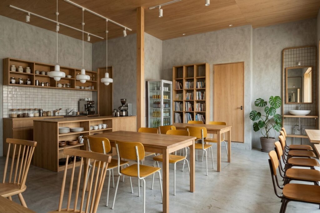 自然素材を活かしたあたたかいデザインの中に、カフェやショップ、美容室、サウナなど多彩な業種が集います。