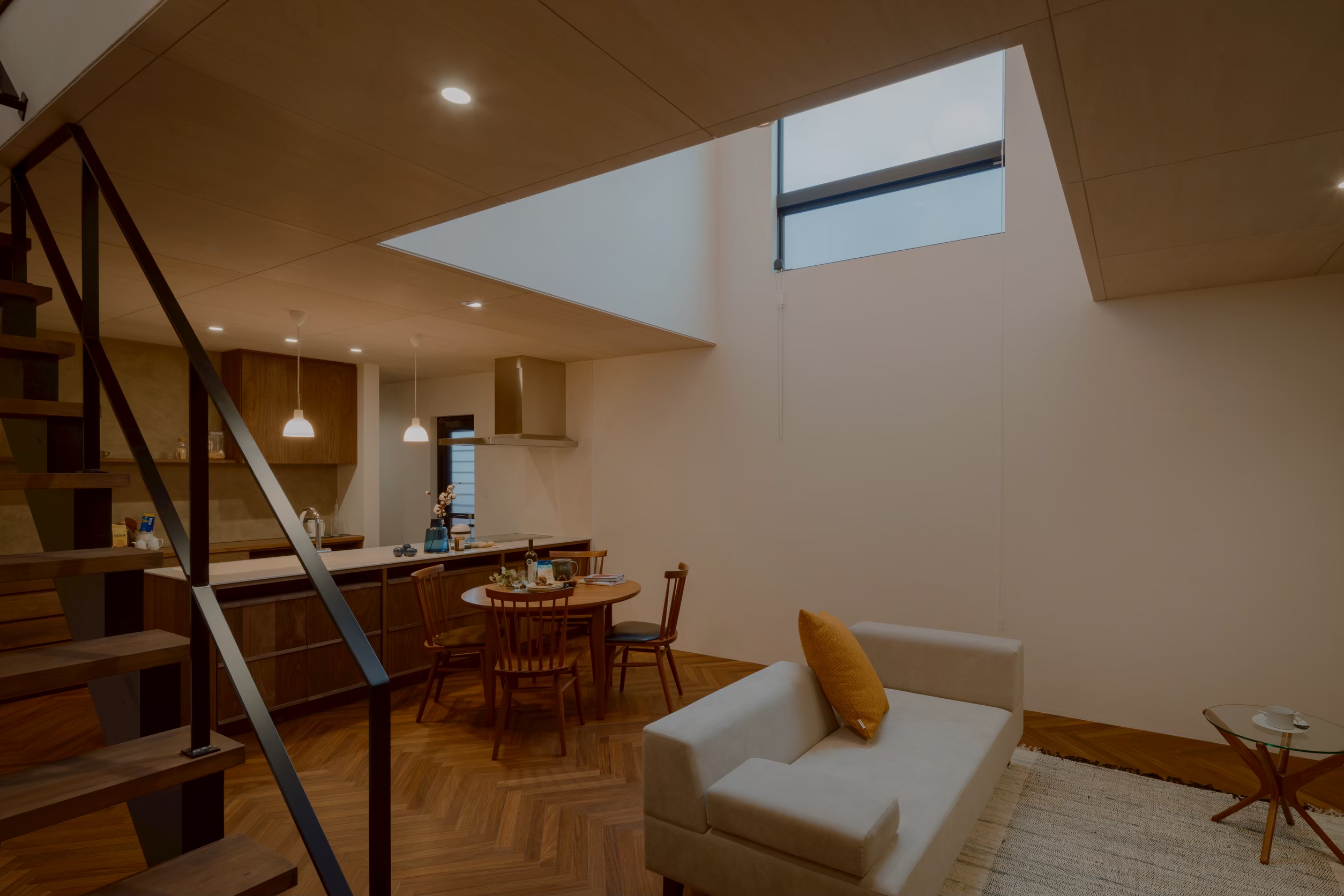 リビング・ダイニングには吹き抜けとストリップ階段があり、視線が抜ける設計で空間に広がりを与えました。