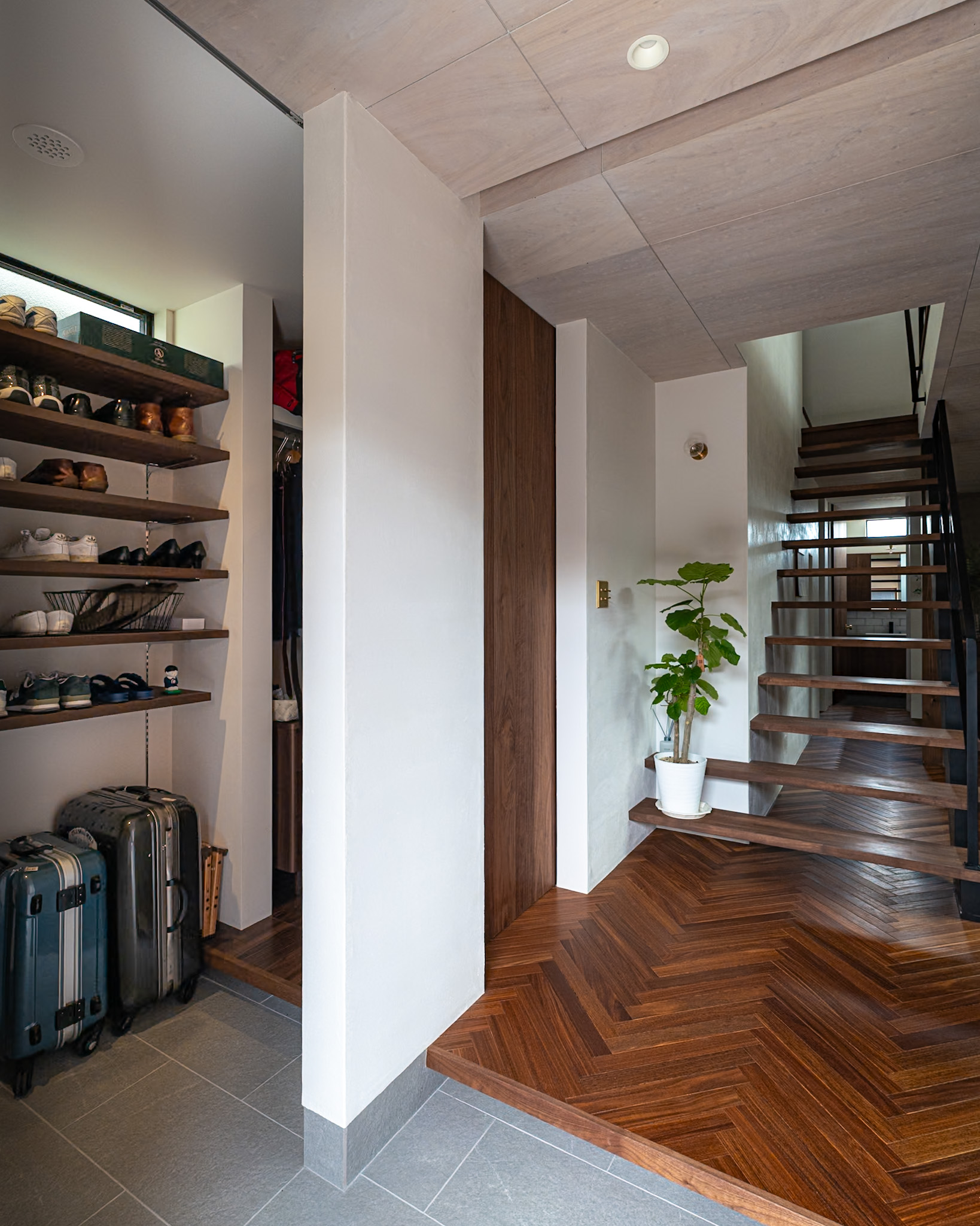 ひとつはそのままリビングへ、もうひとつはシューズクロークからWIC、そして脱衣室へとつながる生活導線。