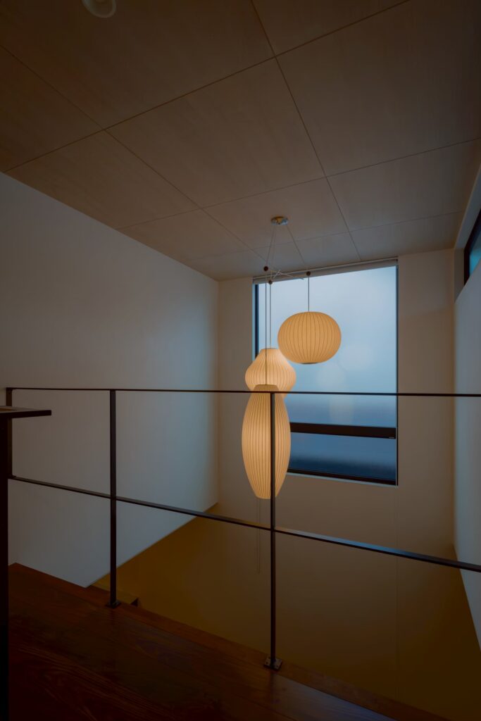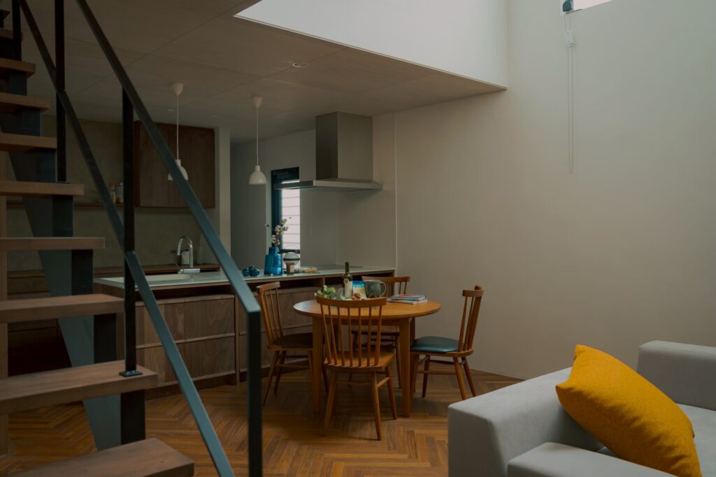 リビング・ダイニングには吹き抜けとストリップ階段があり、視線が抜ける設計で空間に広がりを与えました。