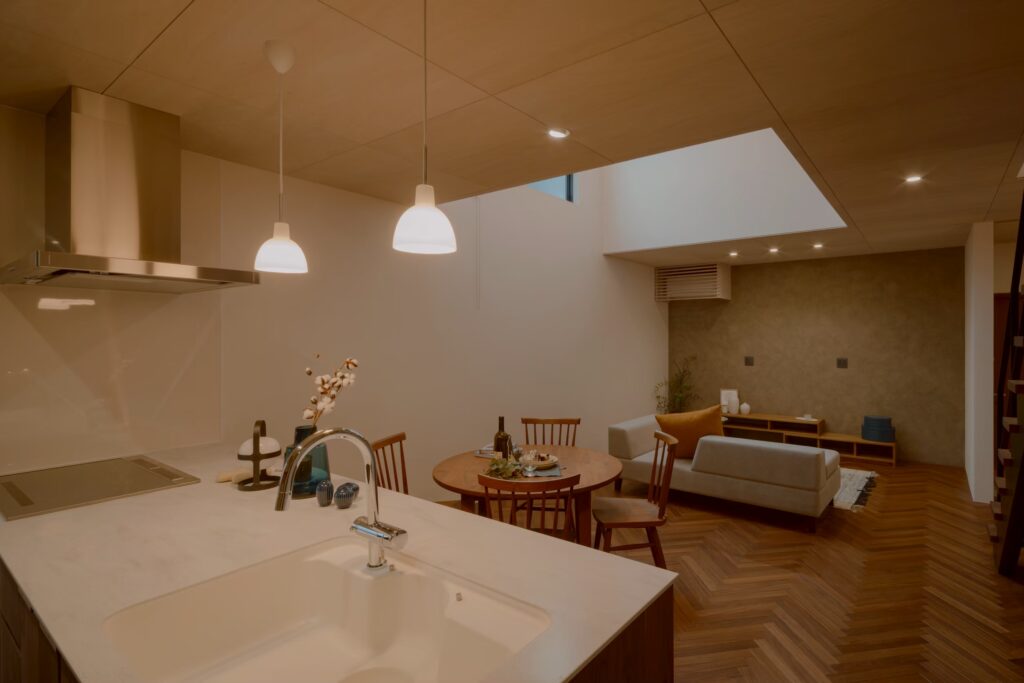 コンパクトなまちなかの敷地に、開放感と暮らしやすさを丁寧に設計した住まいです。