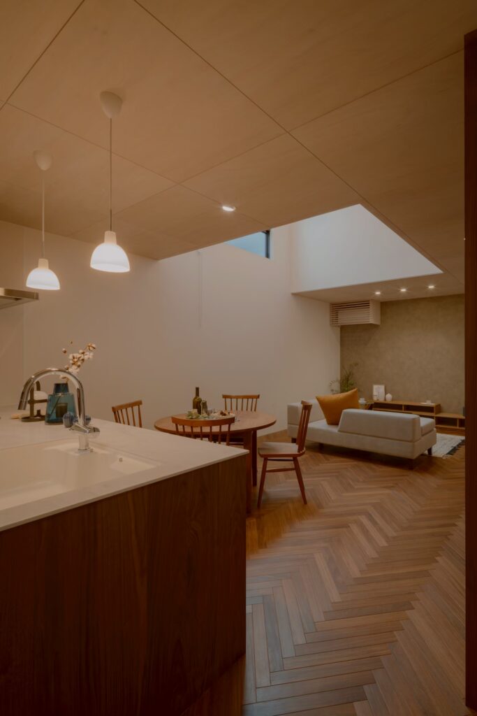 床には無垢のクク材を使ったヘリンボーン貼りを採用し、ラフすぎず、上質さを感じる雰囲気に。
