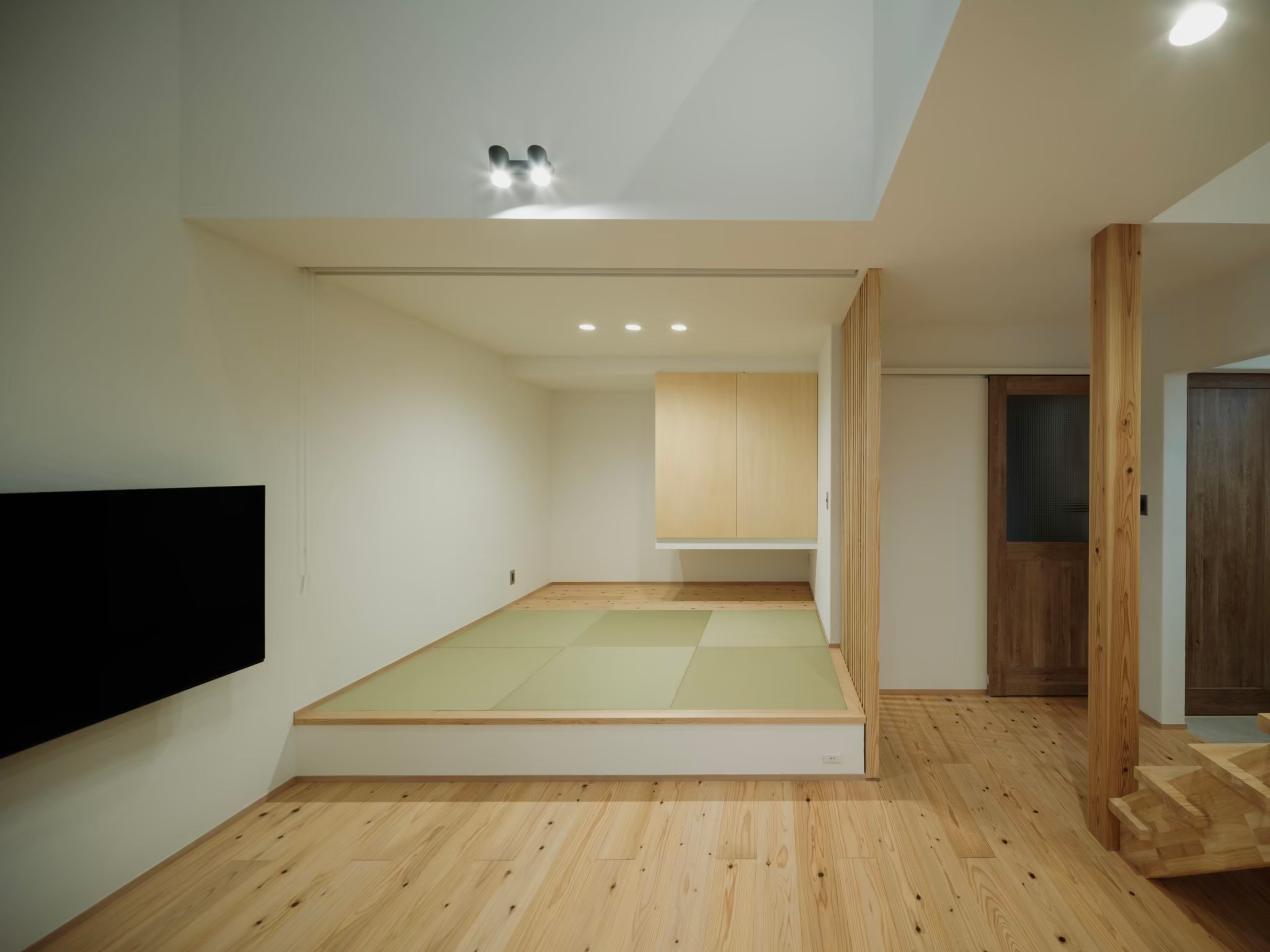 ソファに座る人と、畳に腰かける人。高さの違いがほどよい距離感を生み、家族それぞれの過ごし方を優しく受け止めてくれます。